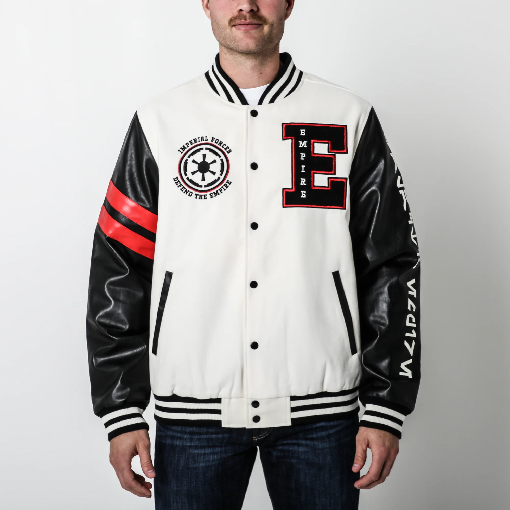 Show your allegiance to the Empire with the Imperial Varsity Jacket by Heroes & Villains. Features - Chenille Patches, Embroidery, AND Screenprint.
